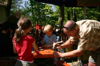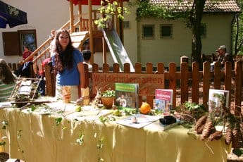 Am „Info-Stand“ gab es neben Literatur und selbst hergestellten Bastelarbeiten auch einige interessante Gespräche. Hier konnten sich Eltern (und auch Großeltern) über den Waldkindergarten und der dahinter stehenden Wald- und Naturpädagogik informieren.