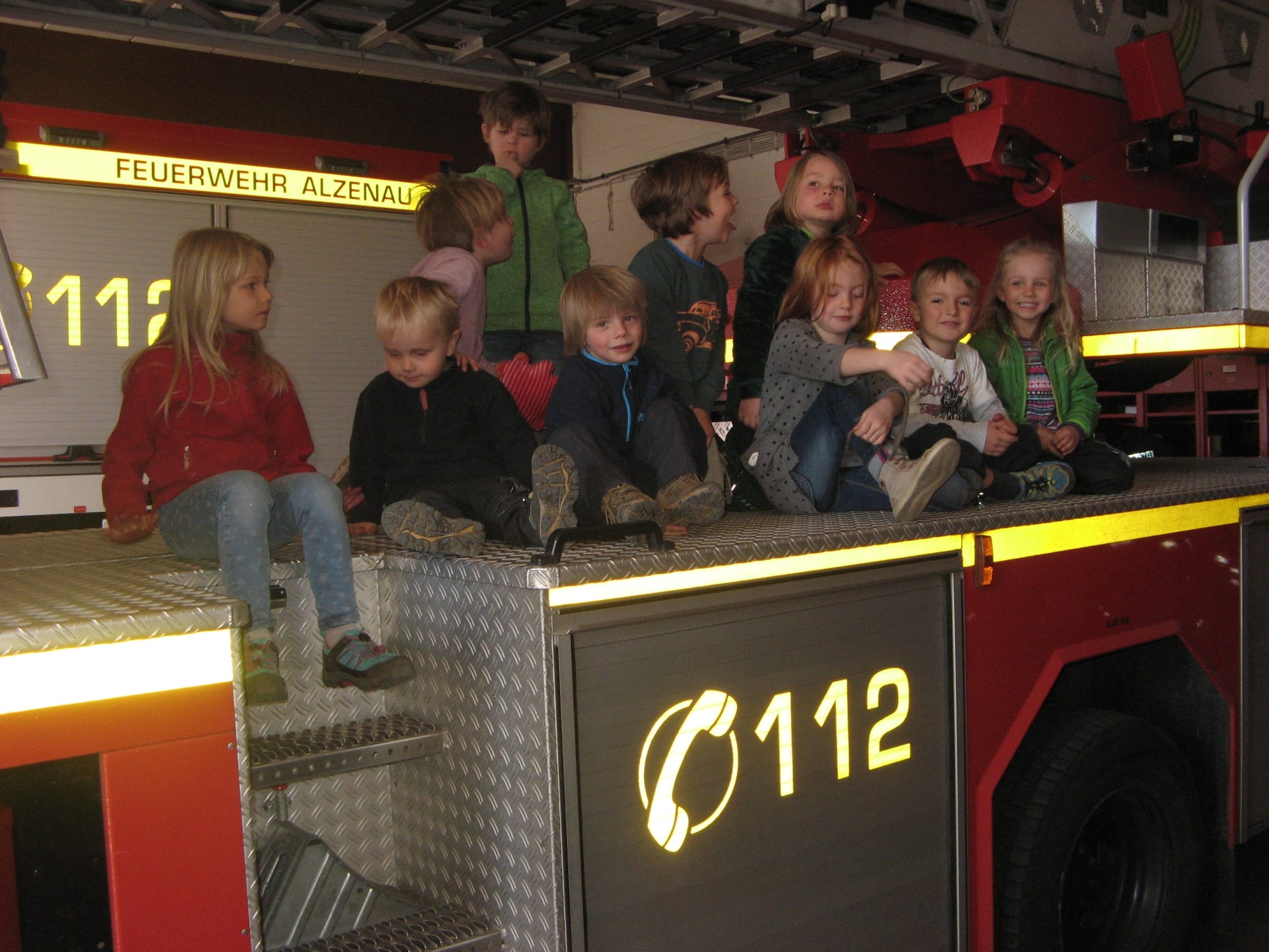 Anschließend wurden den Kindern die Funktionen der Feuerwehrmontur erklärt und sie bekamen die Chance diese auch anzuprobieren. Danach gab es eine Führung durch die Fahrzeughalle, bei welcher die Kinder sich in verschiedene Einsatzfahrzeuge setzen durften und Gelegenheit hatten, die Feuerwehrmänner mit Fragen zu löchern. Bei der Besichtigung der restlichen Wache konnte beobachtet werden, wie Schläuche und Ausrüstung nach einem Einsatz gereinigt werden. Ganz Besonders beeindruckte die Kindern das riesige Lager der Feuerwehr. Zufälligerweise bot sich zum Ende des Ausfluges ein ganz besonderes Ereignis: Auf einmal läuteten die Alarmglocken, da ein Einsatz der Feuerwehr nötig war! Die Kinder sprachen noch Tage danach davon, wie unfassbar schnell alle Feuerwehrleute in voller Montur einsatzbereit waren und abrücken konnten.