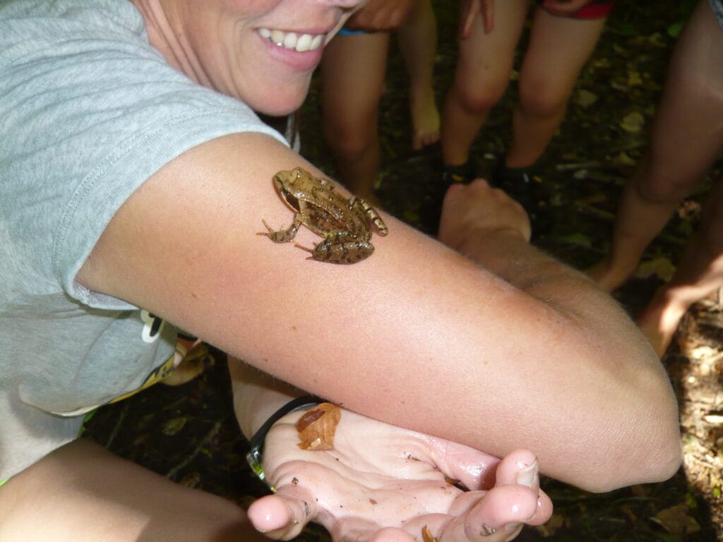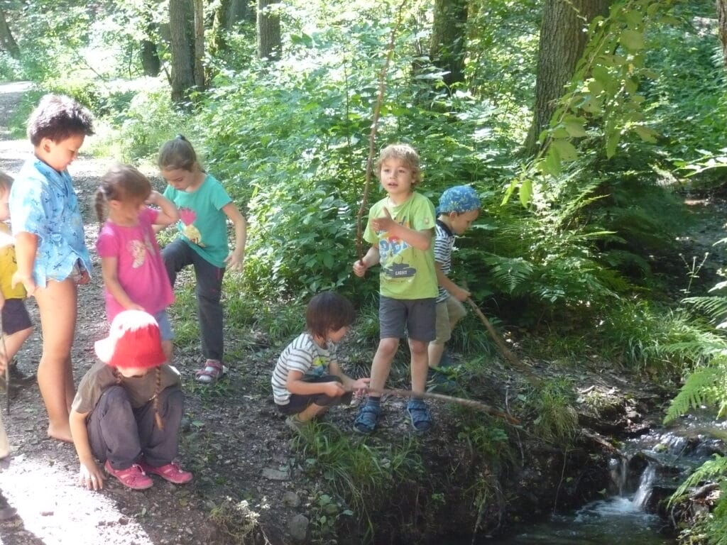 Das Sommerwetter haben wir für einen Ausflug zum Krebsbach genutzt. Der Bachlauf durch den schönen Oberwald ist ja ein wunderbares Stück Natur. Das war für die Kinder ein tolles Erlebnis. Bei hochsommerlichen Temperaturen konnten wir dort durchs kühle Wasser waten und Staudämme bauen. Unterwegs begegneten wir einem glitschigen und lustigen Springfrosch. Bevor wir den Rückweg antraten, hatten wir noch sehr viel Spaß daran, kleine Steinchen in den Bach zu werfen.
