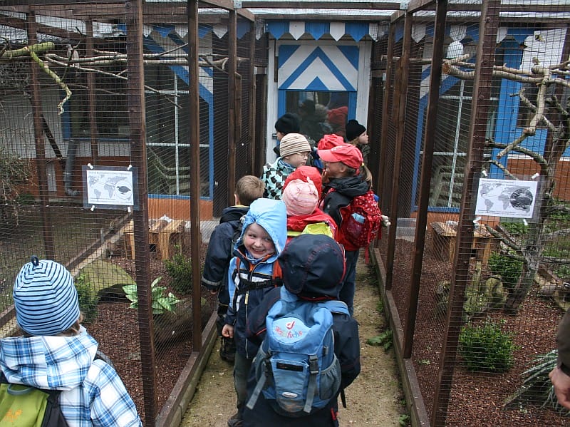Es gab auch allerlei anderes kurioses Geflügel, Forellen und Hasen. Sogar drei lustige Eichhörnchen konnten die Waldkinder aus nächster Nähe betrachten.