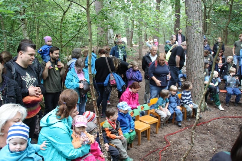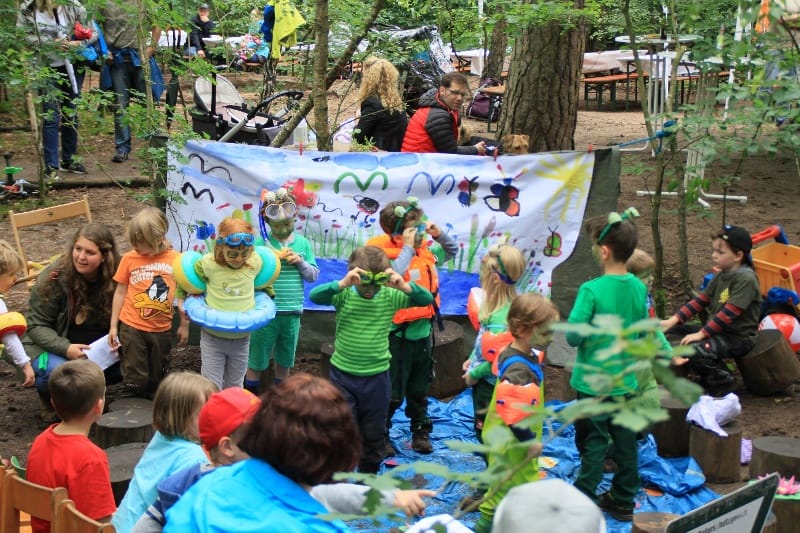 Kleine Besucher ließen sich schminken und auch das Bastelangebot wurde gerne genutzt. Auf dem Kindergartengelände boten Foto-Collagen schöne Einblicke in den Alltag und die Aktivitäten der Waldkindergarten-Kinder. Um 14 Uhr führten die Waldkinder ihr Theaterstück „Monos Teich“ auf. Darin ging es um Frösche und Enten, die ihren Teich verlassen mussten, nachdem eine Gruppe Kinder sämtlichen Müll und die Reste ihres Picknicks am Ufer des Teichs zurückgelassen hatten. Erst als die Kinder gemeinsam den gesamten Müll beseitigten, konnten die Tiere wieder zu ihrem Teich zurückkehren.