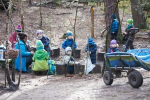 Am Ende des Vormittags findet ein Abschlusskreis statt, in welchem die Kinder von ihren Erlebnissen des Tages erzählen, Lieder singen, oder noch gemeinsam etwas spielen. Bepackt mit Rucksack, kleinen Bastelarbeiten oder gefundenen Schätzen werden die Waldkinder meist schmutzig, müde, jedoch sehr entspannt und glücklich wieder von ihren Eltern abgeholt.