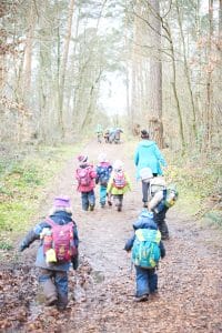 Zweimal wöchentlich geht es auf eine kleine Wanderung. Unter einem bestimmten Motto (z. B. „Wer findet den schönsten Pilz?”) wird die Umgebung in der Nähe des Waldkindergartens erkundet. Auf gemütlichen Plätzen inmitten der Natur lassen sich die Kinder ihr Frühstück schmecken, und es werden immer wieder neue und spannende Orte zum Spielen entdeckt.