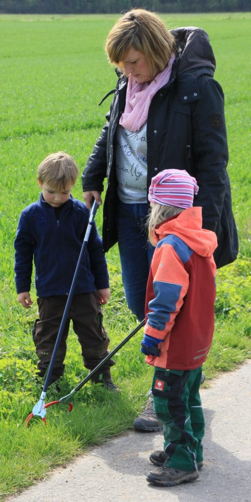 Mit Zangen, Handschuhen und Müllsäcken bewaffnet, sammelten die Kinder und ihre Eltern auf den Wegen rund um das Waldkindergartengelände zurückgelassenen Müll ein. Erfreulicherweise wurde neben einem Regenschirm, einem Fahrradschlauch und einer Luftpumpe nur noch wenig Unrat, wie z.B. achtlos weggeworfene Taschentücher am Wegesrand gefunden.