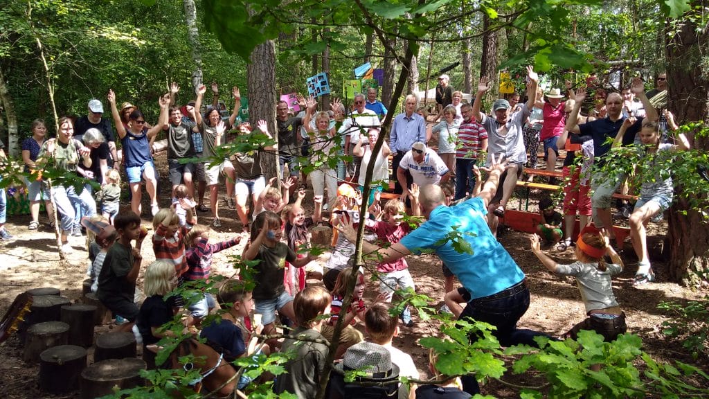 In dem um 14.00 Uhr eingeläuteten offiziellen Teil dankte der neue Vorstand dem Alten für seine herausragend gute Arbeit, der Gründer des Waldkindergartens Oliver Reß blickte 10 Jahre zurück zu den Anfängen des Waldkindergartens und der Bürgermeister sprach seine Glückwünsche zu diesem Jubiläum aus und verteilte Äpfel, in die das Logo des Kindergartens gelasert wurden, an die Kinder. Und nun war es endlich soweit, das lang ersehnte Theaterstück der Waldkinder konnte beginnen. Dieses Jahr wollten zwei Dachse ein Konzert geben und machten sich auf den Weg durch den Wald, um Eichhörnchen, Füchse, Buntspechte, Bienen und Schmetterlinge für ihr Projekt zu gewinnen. Die Tiere trafen sich und nach einem Soundcheck konnte laut und fröhlich losgeträllert werden. Alle Besucher waren hin und weg, denn die von den Waldkindern selbstgebastelten Instrumente und auch das von den Erziehern gedichtete Lied über den etwas anderen Kindergartenalltag machten dieses Stück zum absoluten Highlight. Aber auch das Mitmachangebot von Thorsten Pötsch, der Groß und Klein zum Tanzen und Mitsingen animierte, sowie der am Nachmittag angebotene Musikworkshop, der zum gemeinsamen Musizieren einlud wurden mit Begeisterung angenommen und rundeten das diesjährige musikalische Motto des Festes ab.