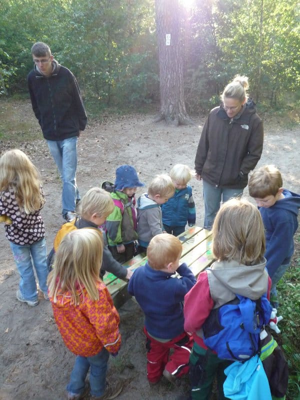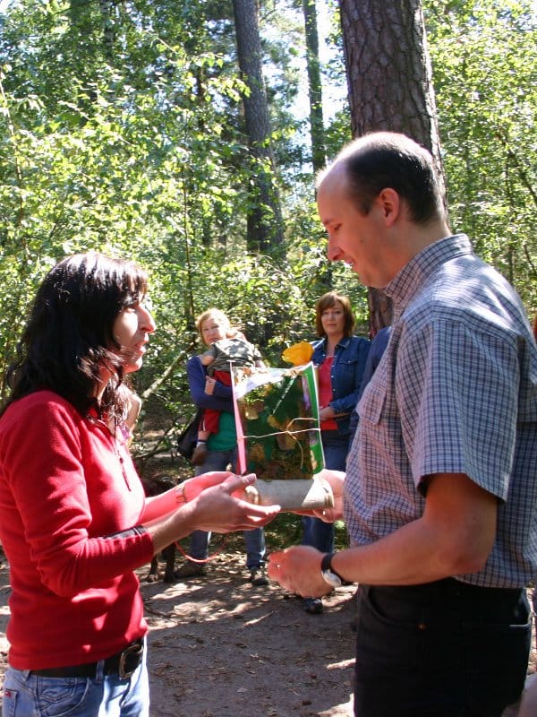 Mit „großem Bahnhof“ wurden unsere sechs Vorschulkinder Anfang September verabschiedet: Nachdem alle mit leckeren Brötchen, Marmelade, Trauben-Käse-Spießen und Saft Abschied gefeiert hatten, erhielten die zukünftigen Erstklässler selbst gebastelte Schultüten mit Walderinnerungen. Als Vorgeschmack auf die Schule sangen die Kinder das Ständchen „Alle Kinder lernen lesen“. Natürlich blieb auch den Vorschülern der obligatorische „Rauswurf“ aus dem Wald nicht erspart und sie mussten durch einen Tunnel kriechen, den die Kinder bildeten, bevor sie von den Erziehern verabschiedet wurden. In diesem Rahmen wurde auch der „Papa“ und langjährige erste Vorsitzende des Waldkindergartens, Oliver Reß mit einem Geschenk von den Erziehern in den (Wald-)Ruhestand verabschiedet.