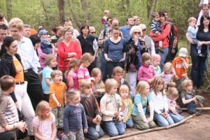 Während die Kleinen geschminkt über die Seilbrücke und den Sinnespfad balancierten, genossen die Großen bei Kaffee und Kuchen die entspannte Atmosphäre im Wald. „Das ist ja wie im Urlaub“ sagte eine Mutter spontan. Und tatsächlich konnten die Besucher ein kleines Stück von dem erleben, was den Waldkindergarten so besonders macht. Das Motto des Waldfestes „Frühlingsfest der Sinne“ wurde durch verschiedene Stationen umgesetzt. Hörmemory, Klangbaum, Sinnesweg, Gucklöcher und Fühlkästen forderten in ungewöhnlicher Weise die Sinne und faszinierten Groß und Klein.